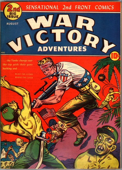 Sales of ‘War Victory Comics’ were so strong that the Treasury Department funded a second printing, but they seemed to realize further direct intervention wasn’t needed because publishers were running enough anti-Nazi material on their own. Harvey Comics published two follow-up issues in 1943 following the popularity of ‘War Victory Comics’, now retitled to ‘War Victory Adventures’. These 2 editions can be seen below.