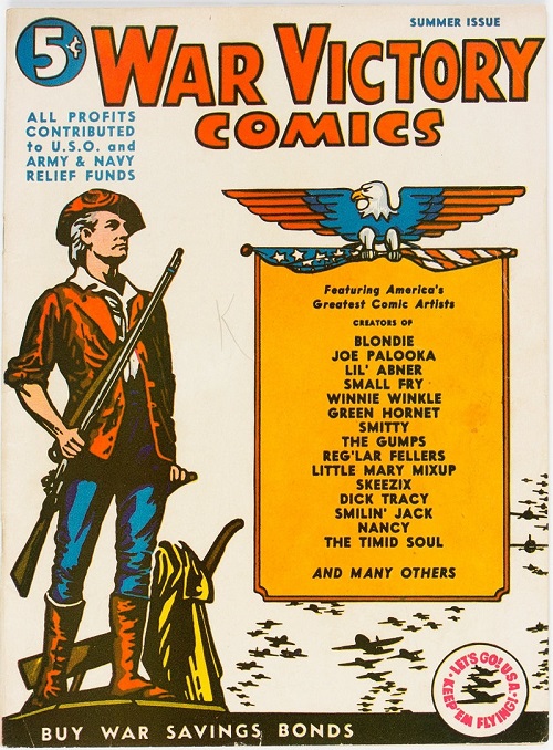 Comic book strips found in the comic include characters such as Superman, Green Hornet and Dick Tracy who weren’t typically seen in comic books published by Family Comics. All profits from the 5 cent comic book were donated to the United States military.