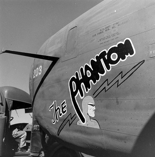 The Phantom is featured as Nose Art on a USAAF aircraft, a Consolidated C-87-CF Liberator Express aircraft flying the air transport route between Brazil and North Africa in 1943. The photo was taken by Thomas McAvoy and is held by the LIFE Magazine Archives.