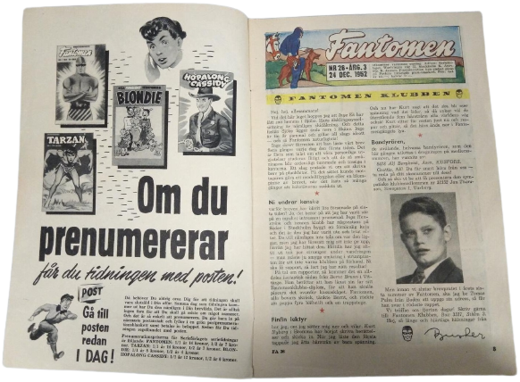 Printed within the inside front cover, a full page advertisement is found, with 4 comic book series offered as a half or full year subscription. These are the Phantom, Tarzan, Blondie and Hopalong Cassidy. The Fantomen comic book featured in the advertisement is edition number 1, published in 1951.