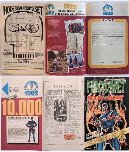 Fantomet comic book number 9, published in Norway in 1982 promotes a Class Trip Scholarship to the value of 10,000 kroner. Below we see the front and back cover of this edition. The front cover advertises, ‘FANTOMETS CLASS TRIP SCHOLARSHIP – 10,000 Kr’.
