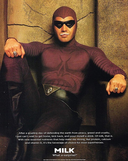 Billy Zane was featured in the Milk Mustache campaign, wearing the Phantom costume as seen in the 1996 Paramount Pictures Phantom movie with the tagline ‘Milk’.