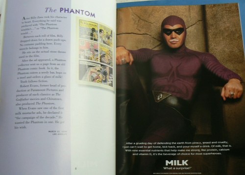 In 1999, Ballantine Books released a 176 page paperback book featuring advertisements which appeared in the Milk Mustache campaign titled, ‘The Milk Mustache Book’. Distributed by Random House, below we see the front and back covers, with the Phantom seen on the front cover.