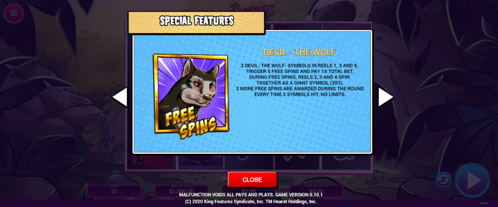 FREE SPINS – 3 symbols will trigger 5 free spins. Reels 2, 3 and 4 become a great 3×3 symbol giving many chances to win. 3 additional Wolf symbols activate 3 new free spins.