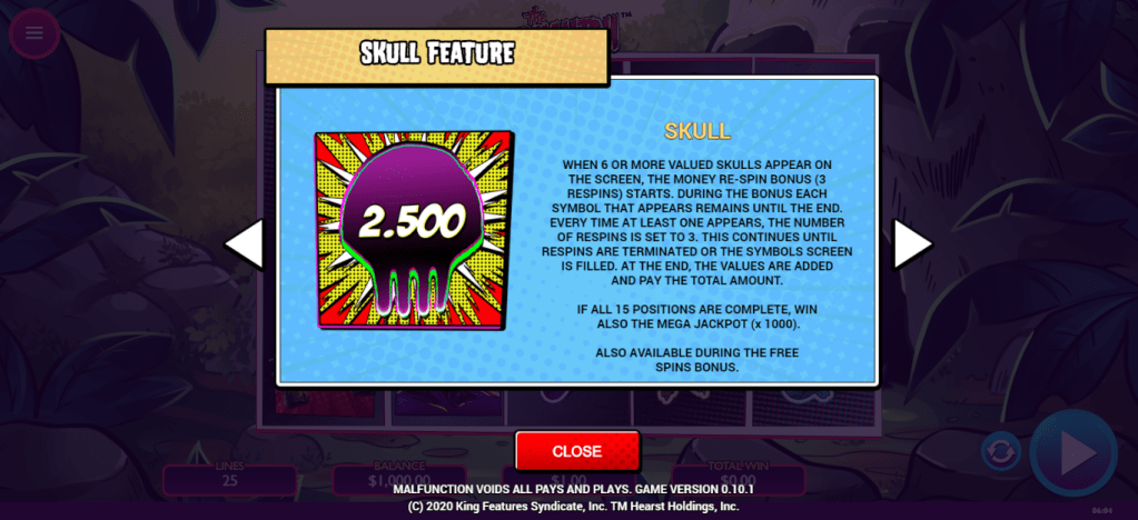 SKULL MONEY RE-SPIN – Each symbol has a money prize. 6 or more trigger the bonus with 3 re-spins. Every time a symbol appears, it grants 3 more re-spins. The bonus ends when all re-spins are used and the winnings are added up, or if all 15 positions are matched with Skulls the player wins the jackpot.