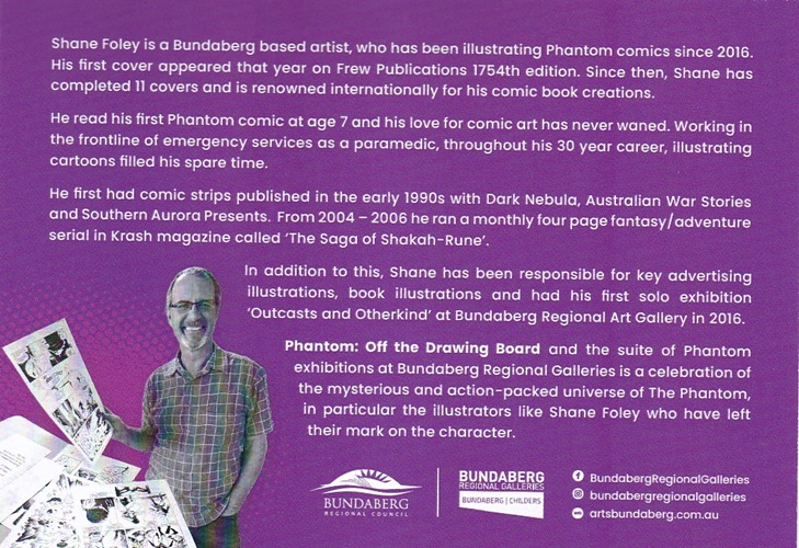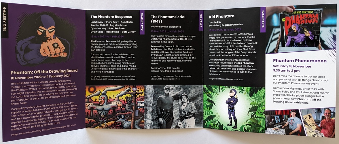 The Bundaberg regional event guide also featured the Phantom: Off the Drawing Board exhibition, amongst other events occurring in the local area in the Summer of 2023. Illustrations of the Phantom by Shane Foley are found on the front and back cover.
