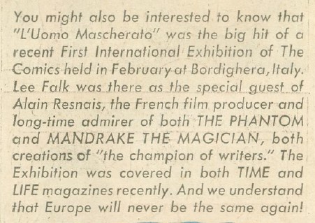 Lee Falk also attended the first International Exhibition of Comics in Bordighera, Italy, which made both local and international press.