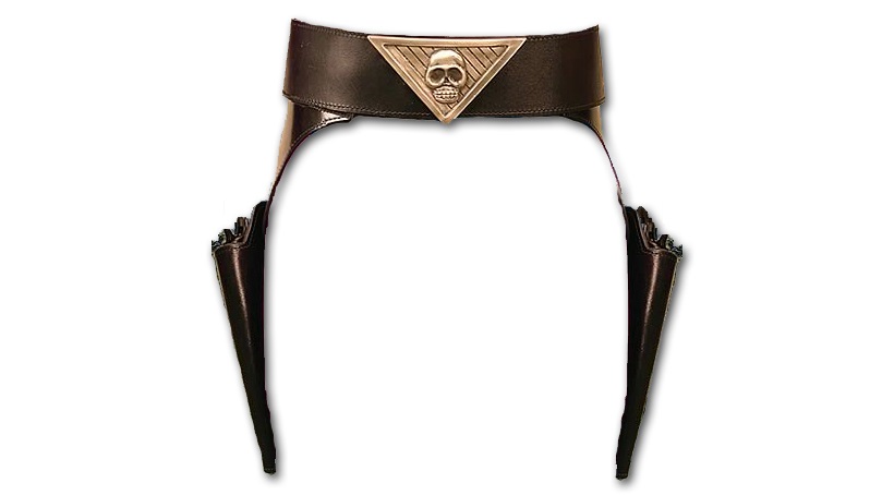 Since the first Phantom, a black leather belt has been worn bearing a skull mark in the center of a silver colored triangle buckle. Throughout the years and different periods in time, the belt has been used to attach an array of weapons, including swords and guns.