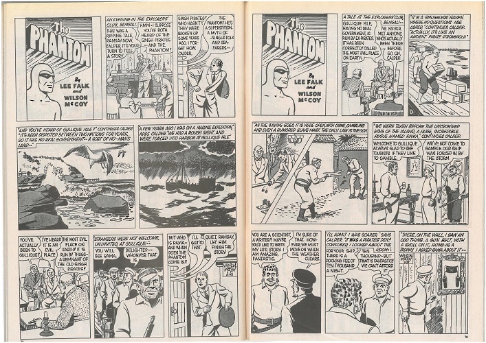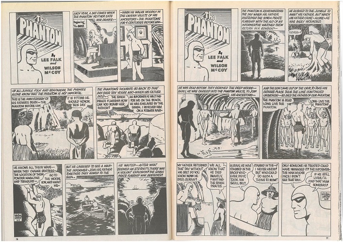 Once the 20th Phantom was killed by a smuggler named Rama who back stabbed the Phantom and used the gun belt as his ‘trophy’. The 21st Phantom finds the killer and retrieves it back and restores it in the Skull Cave. This Lee Falk story drawn by Wilson McCoy is titled ‘The Belt’, first appearing in newspapers on the 7th of February 1954. See below story.