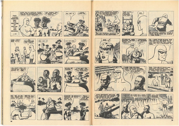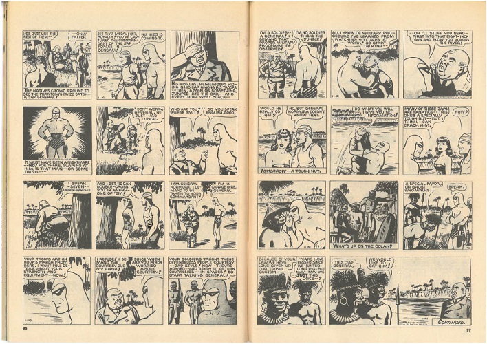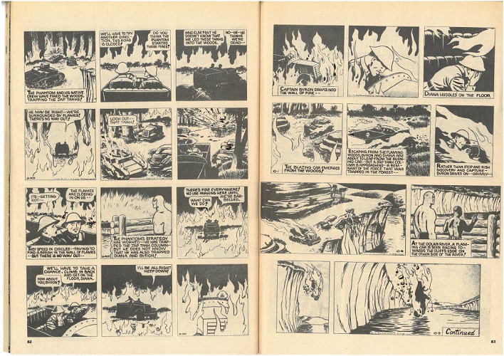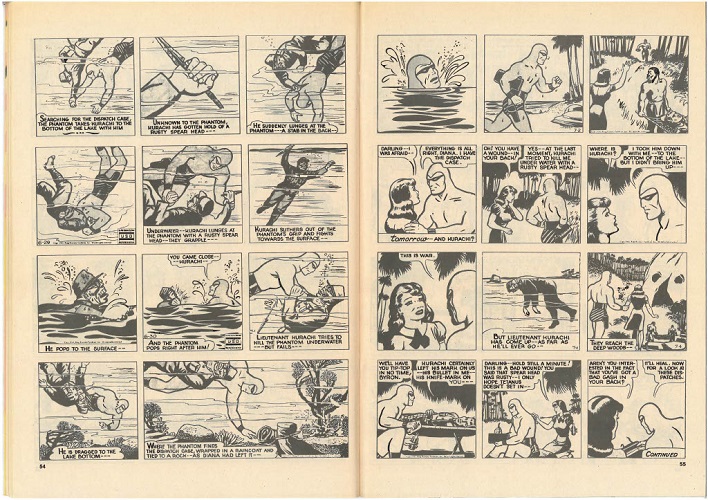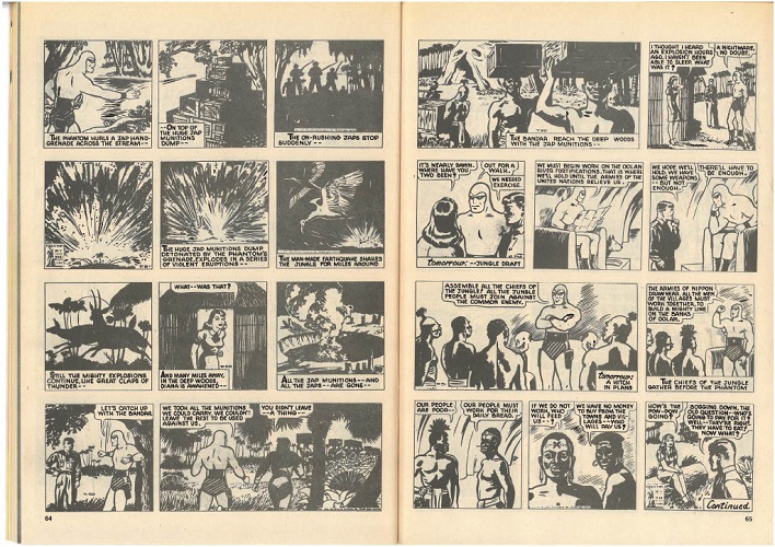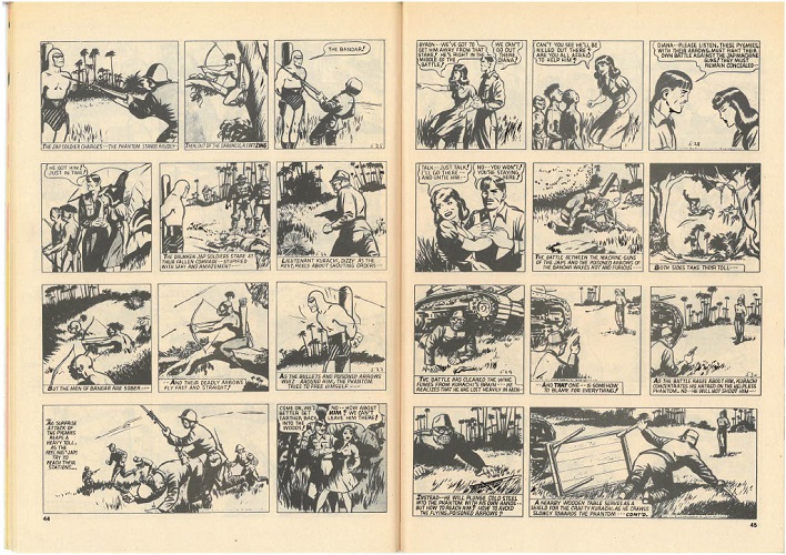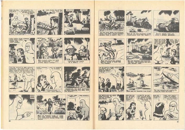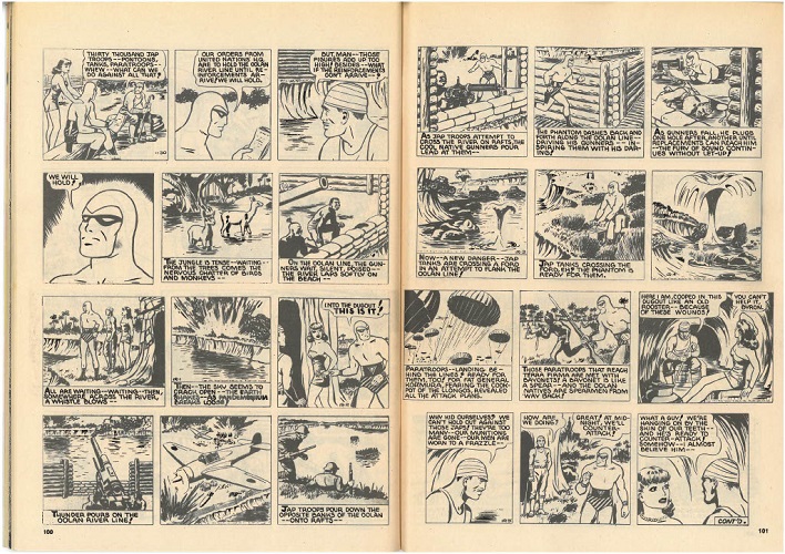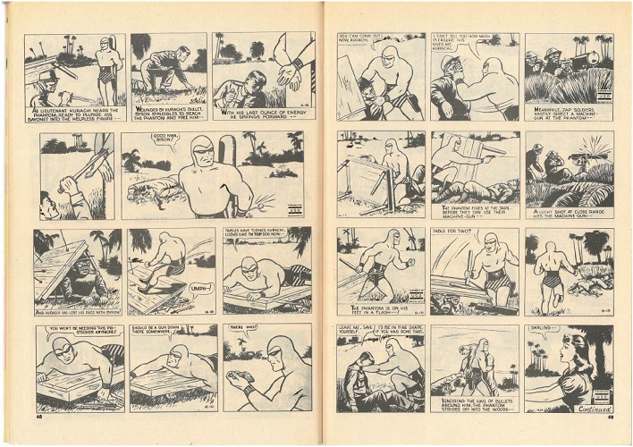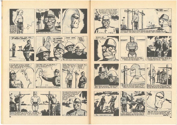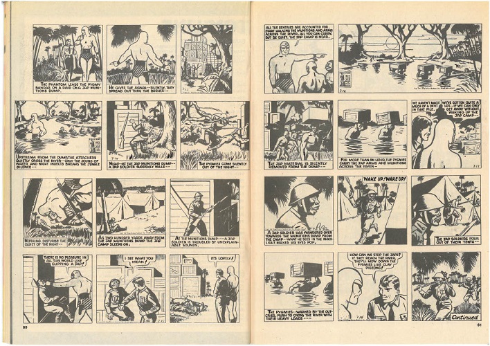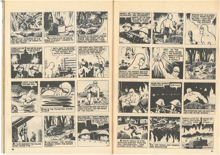 Note that the war action is between the Japanese and the British and the native refers to the Phantom as ‘Shadow’, a very odd translation from the Phantom’s Italian name which is ‘L’Uomo Mascherato’.