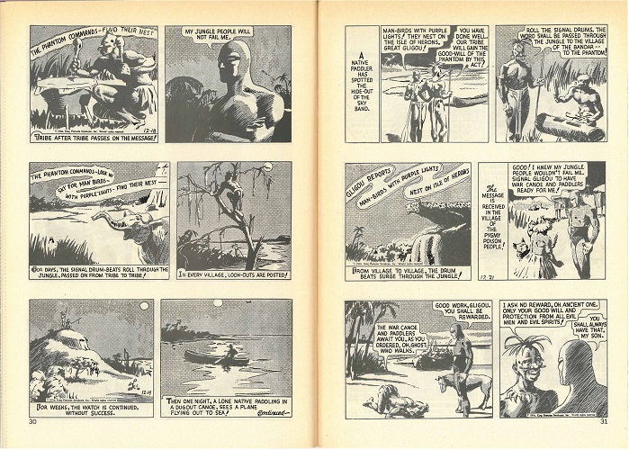 Serious Phantom historians will note the many ingredients of the early formats which gradually faded out of existence. In The Sky Band, Guran was a ‘witch doctor’, the Bandar tribe members still looked to the Phantom as something of a god figure (note the scene when a tribesman actually prostrates himself in front of The Ghost Who Walks!) and a reference by Diana to… ‘the natives of the Orient think the Phantoms immortal’. That statement clearly places the Phantom’s base in the East (India perhaps?) and not, as was later broadly suggested, in Africa.