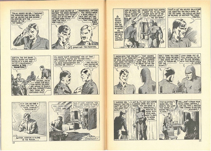 Lee had two options available before he commenced a second story, create a new adventure far removed from The Singh Brotherhood characters or continue the these. All of us are lucky he decided on the later because The Sky Band developed into a classic example of comics story telling. The beginnings of the romance between the Phantom and Diana is continued, complete with all the misunderstandings which lasted until they finally married, the unfathomable Sala character is given another opportunity to establish herself and Captain Melville Horton is again showcased.