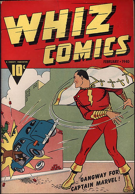 There are a number of Captain Marvels in the Marvel Universe, but the one seen here debuted in Whiz Comics #2 (cover-dated Feb 1940) and is now owned by DC. He proved so popular in the 1940’s that sales of his comic books outsold those featuring Superman. He’s also known as “Shazam”, after the cry that changes the boy Billy Batson into the mighty Captain Marvel.