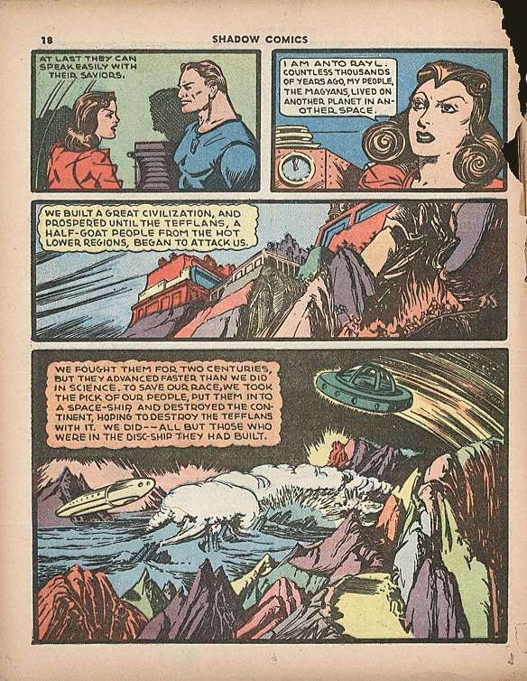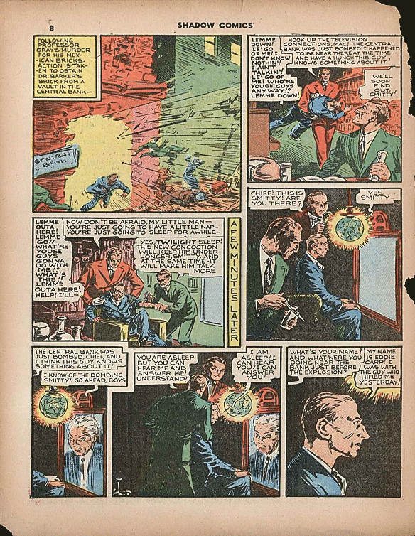 In the radio drama, which debuted in 1937, The Shadow was an invisible avenger who had learned, while “traveling through the Orient,” “the mysterious power to cloud men’s minds, so they could not see him.” This feature of the character was born out of necessity: Time constraints of 1930’s radio made it difficult to explain to listeners where The Shadow was hiding and how he was remaining concealed. Thus, the character was given the power to escape human sight. Voice effects were added to suggest The Shadow’s seeming omnipresence. To explain this power, The Shadow was described as a master of hypnotism, as explicitly stated in several radio episodes.